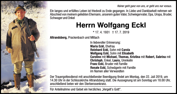 Ein Sprecher der Jagdgenossenschaft Altrandsberg ehrte Wolfgang Eckl mit einem Blumengebinde und führte aus, der Verstorbene sei jeden Tag mit seinem Geländewagen im Revier unterwegs gewesen und habe stets guten Kontakt mit den Landwirten gepflegt.