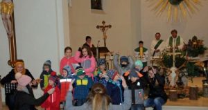 Die Kinder aus dem Bauernhof-Kindergarten beteiligten sich an der Gestaltung der Hubertusmesse, die Pfarrer Kilian Limbrunner und Diakon Szörenyi mit Jägerinnen und Jägern in der Pfarrkirche Lederdorn feierten.