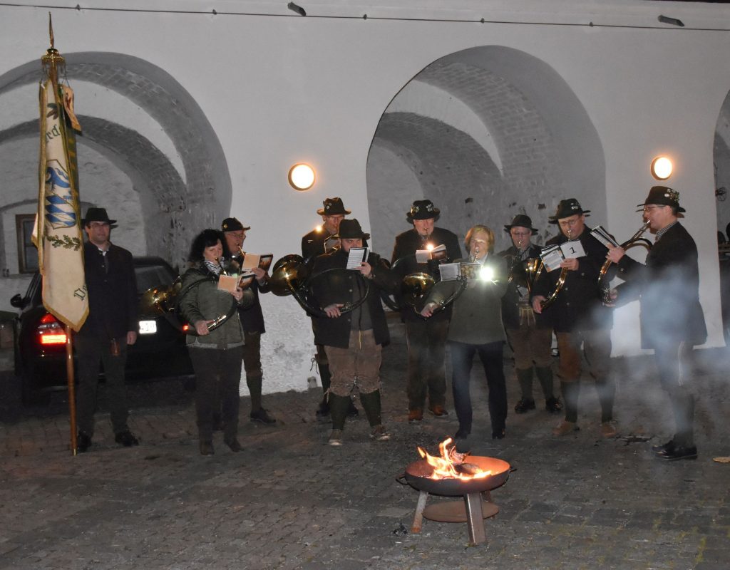 Vor der im Fackelschein erleuchteten Schlosskirche St. Martin in Altrandsberg hießen die Parforcehorn-Bläser der Kreisgruppe Bad Kötzting die Jägerinnen und Jäger sowie die vielen Gläubigen willkommen. Foto: Wolfgang Baumgartner